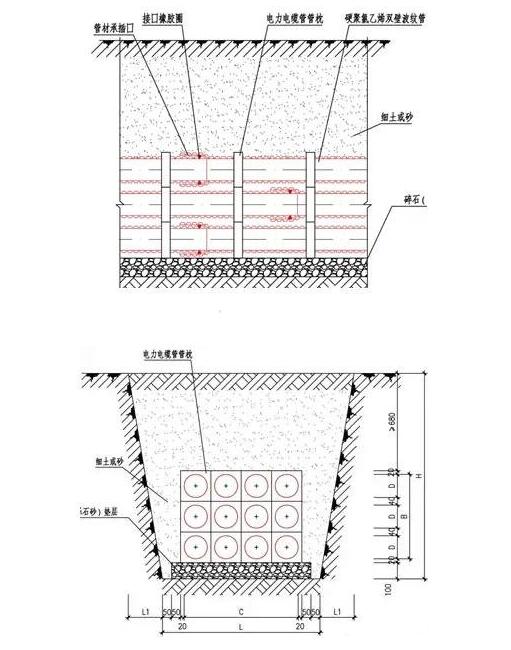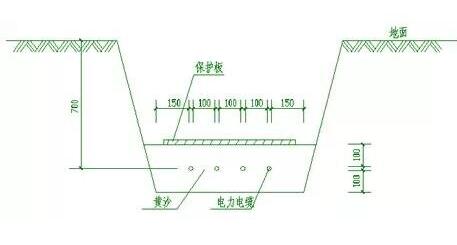 直埋敷設(shè)是將電纜直接埋在地下的一種敷設(shè)方式,其具有投資省的顯著優(yōu)點(diǎn),是廣泛應(yīng)用的一種敷設(shè)方式。直埋電纜的深度不應(yīng)小于0.7m,穿越農(nóng)田時(shí)不應(yīng)小于1.0m。直埋電纜的溝底應(yīng)無(wú)硬質(zhì)雜物,溝底鋪100mm厚的細(xì)土或黃沙,敷設(shè)后再加蓋100mm的細(xì)土或黃沙,然后用水泥蓋板保護(hù),其敷設(shè)寬度應(yīng)超過(guò)電纜兩側(cè)各50mm,也可用磚塊替代水泥蓋板?;靥钪翜系囊话霑r(shí),鋪設(shè)警示帶,回填完成后,在電纜轉(zhuǎn)彎處、中間接頭處、與其他管線相交處等特殊路段放置明顯的方位標(biāo)志和標(biāo)樁,以增強(qiáng)防止外力破壞能力。