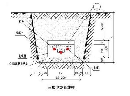 電纜槽敷設(shè)是在開(kāi)挖后,溝槽底板采用100mm~150mm厚混凝土墊層,兩側(cè)溝壁采用240mm磚墻,溝底鋪100mm厚的細(xì)土或黃沙,敷設(shè)后再加蓋100mm的細(xì)土或黃沙,蓋板采用水泥蓋板。深度不應(yīng)小于0.7m,穿越農(nóng)田時(shí)不應(yīng)小于1.0m。這種方式相對(duì)直埋敷設(shè)來(lái)說(shuō),對(duì)電纜的保護(hù)稍好,適用于地形稍復(fù)雜的地段。